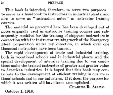 Allen, C. R. (1919). The Instructor, the Man and the Job: A Handbook for Instructors of Industrial and Vocational Subjects. Philadelphia and London: J. B. Lippincott Company.