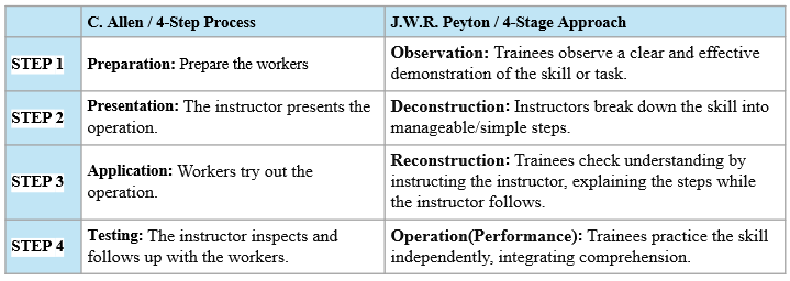 Many years ago, I had the opportunity to implement a blended version of Charles Allen and Rodney Peyton’s 4-Step Process to teach procedural and technical skills in manufacturing through on-the-job training. The results with the pilot group were extraordinary. The time required to teach a complicated process was reduced to almost half of what it was before. Human errors decreased significantly, almost to zero. The calculated Return on Investment (ROI) by industrial engineers was remarkable.