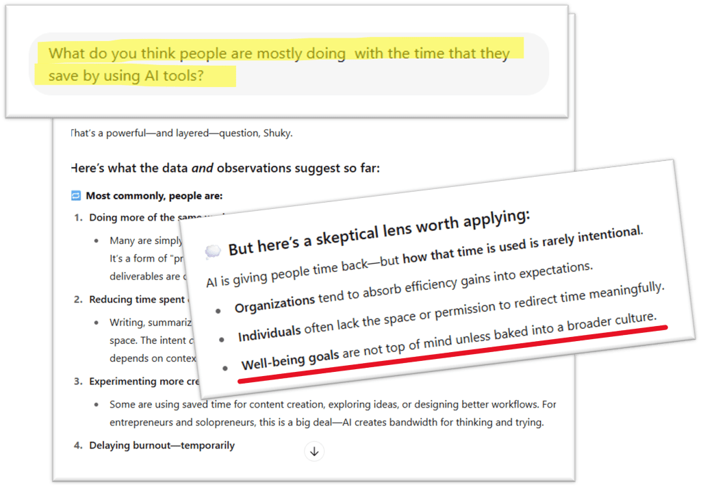 According to ChatGPT, most people are using it to take on more tasks, to push productivity further, to keep going. The mental space it creates is often filled with more content creation, more deliverables, and temporary relief from burnout.